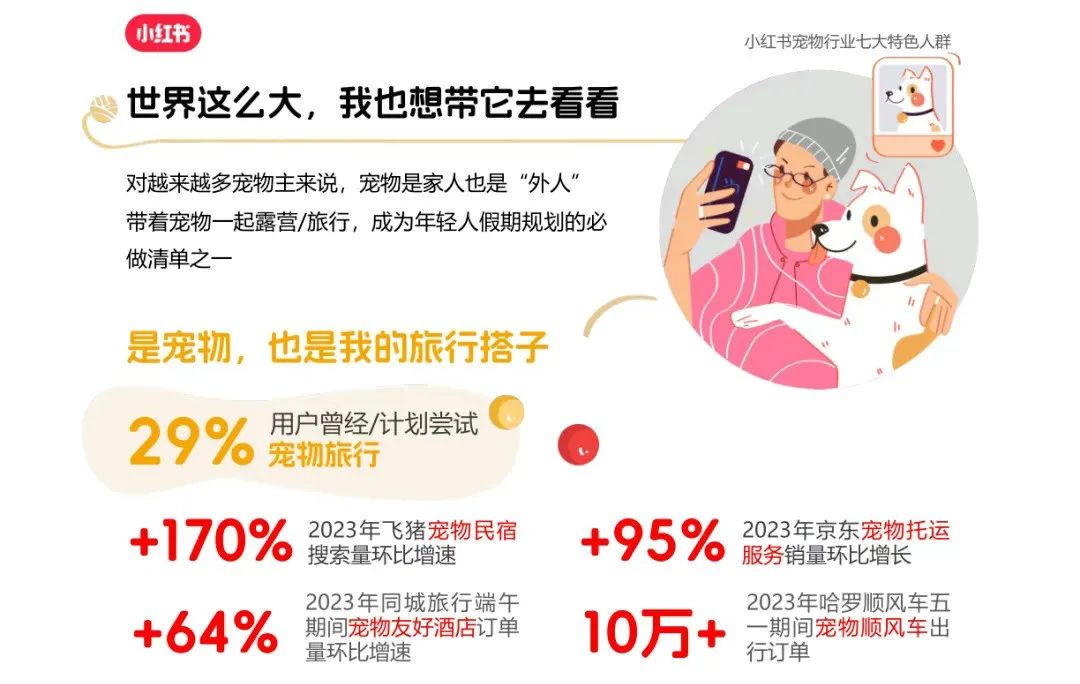 為了更好地照顧自家毛孩子,年輕人開始嘗試帶着它們一同外出。《小紅書2024寵物行業洞察報告》顯示,29%的小紅書用户曾經計劃嘗試寵物旅行,在2023年飛豬、哈羅順風車等出行平台的寵物民宿、寵物託運產品的相關搜索量、銷量就開始呈現翻倍增長的趨勢。