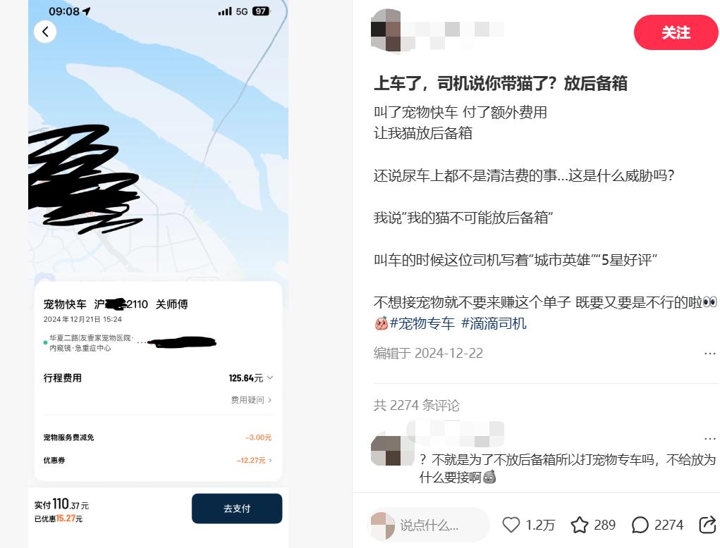 但並不是每個鏟屎官都像陳琦這麼幸運。社媒平台上網友提起寵物出行,談到的大多是“拒載”“嫌棄”。有網友表示,在上海打寵物快車付了額外費用,但司機卻讓自己把貓放進後備箱;還有司機經常會詢問寵物是否掉毛,養寵人對此都很無奈,“既然收了清潔費,為什麼還要詢問掉毛的問題?就像人會脱髮,寵物怎麼可能不掉毛?”