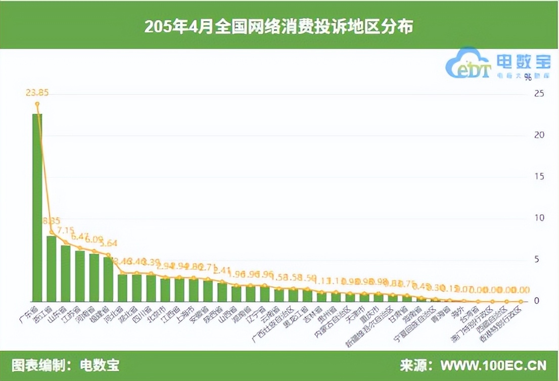 4月“電訴寶”受理投訴用户聚集地區TOP10依次為廣東省(23.85%)、浙江省(8.35%)、山東省(7.15%)、江蘇省(6.47%)、河南省(6.09%)、福建省(5.64%)、河北省(3.46%)、湖北省(3.46)、四川省(3.39%)、北京市(2.94%)。