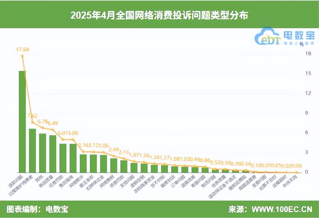 據“電訴寶”顯示,2025年4月全國網絡消費投訴問題類型TOP10中,退款問題佔比高達17.68%,其餘問題類型依次為:過度維護消費者(7.62%)、其他(6.78%)、商品質量(6.49%)、任意罰款(5.01%)、售後服務(5.00%)、網絡欺詐(3.16%)、霸王條款(3.12%)、扣押保證金(3.06%)、網絡售假(2.49%)。