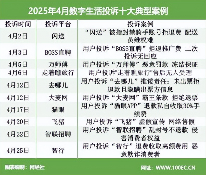 報告涉及了數字零售(主要集中在生鮮電商、二手電商)、數字生活(主要集中於生活服務電商、在線旅遊)及數字教育、產業電商、金融科技、物流科技等領域。報告公佈了2025年4月網絡消費投訴數據及**《數字零售十大典型投訴案例》、《數字生活十大典型投訴案例》和《數字教育十大典型投訴案例》**。
