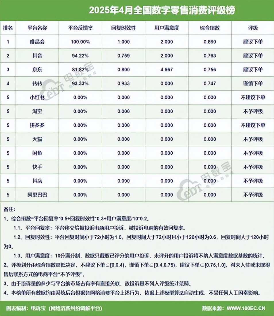 在2025年4月全國數字零售評級榜中:獲**“建議下單”的有:唯品會、抖音、京東等3家;獲“謹慎下單”評級的有:轉轉等1家;獲“不建議下單”的有:小紅書等2家;獲“不予評級”**的有:淘寶天貓、閒魚、快手、抖店、阿里巴巴等5家。