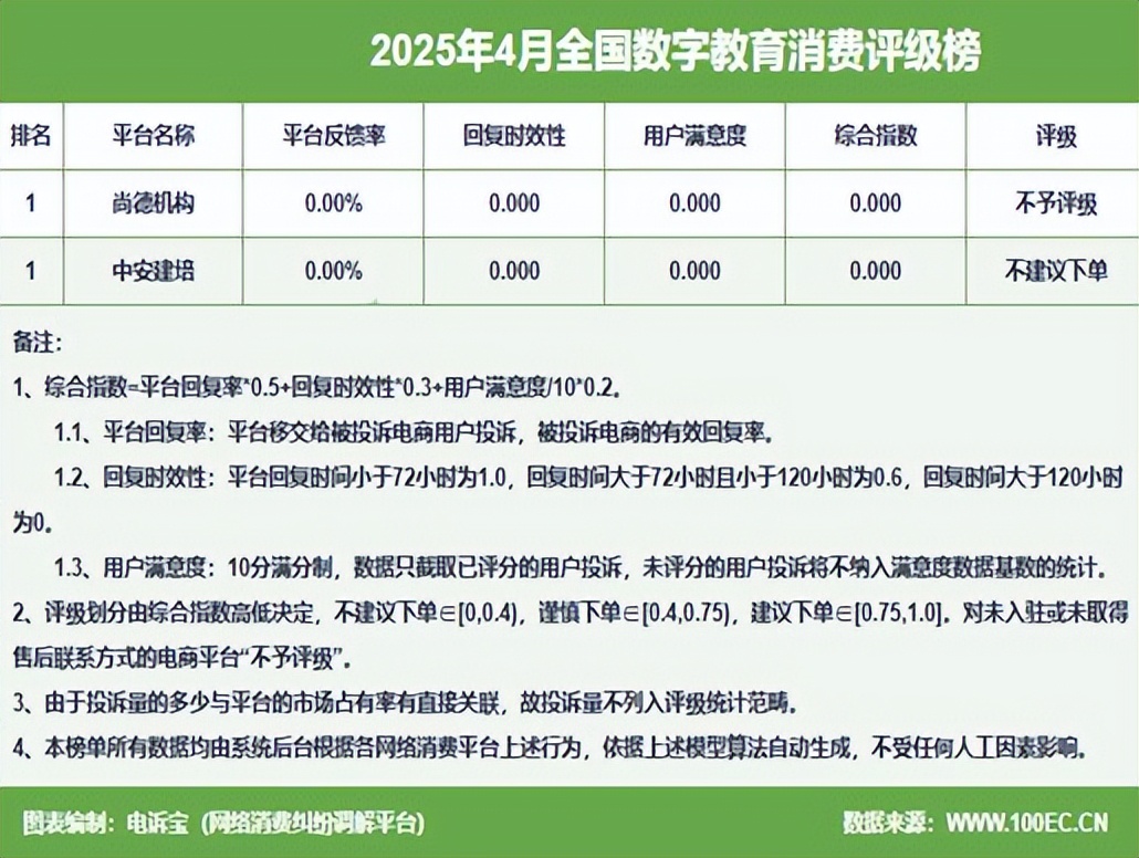 在2025年4月全國數字教育評級榜中:獲“不予評級”的有:尚德機構等1家;獲“不建議下單”的有:中安建培。