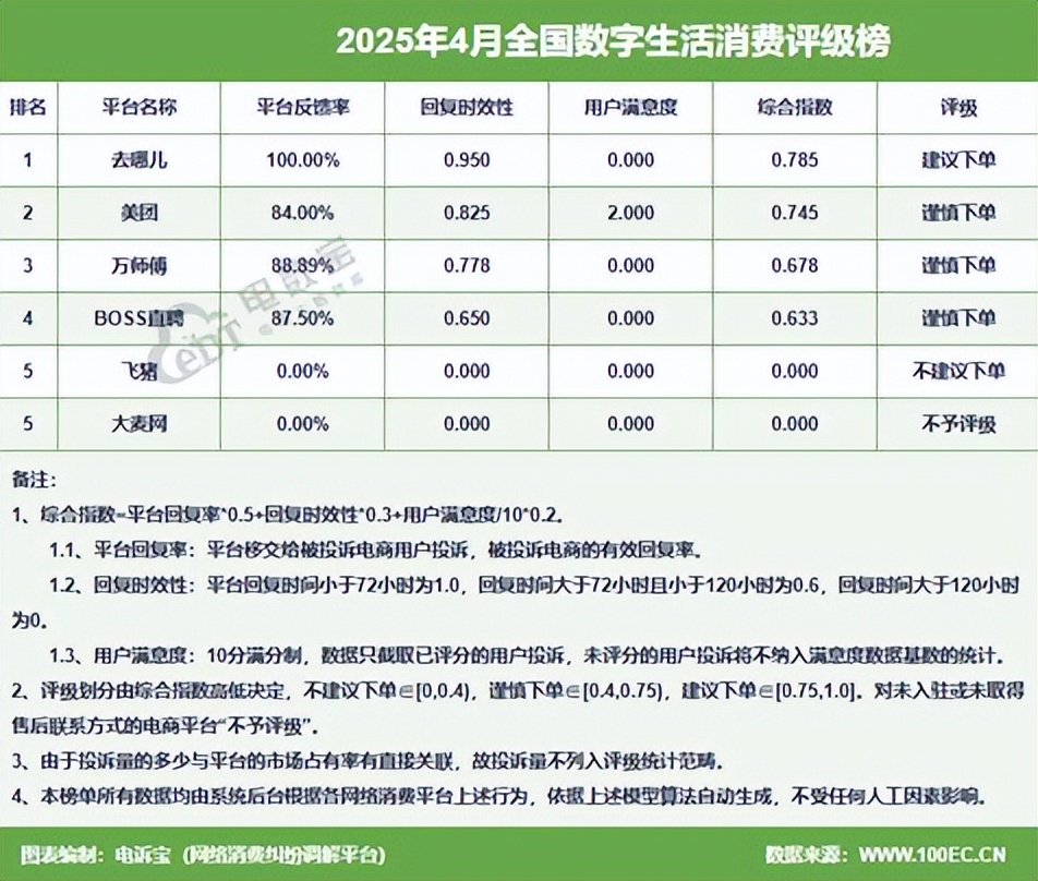 在2025年4月全國數字生活評級榜中:獲“建議下單”的有:去哪兒等1家;獲“謹慎下單”評級的有:美團、萬師傅、BOSS直聘等3家;獲“不建議下單”的有:飛豬等1家;獲“不予評級”的有:大麥網等1家。