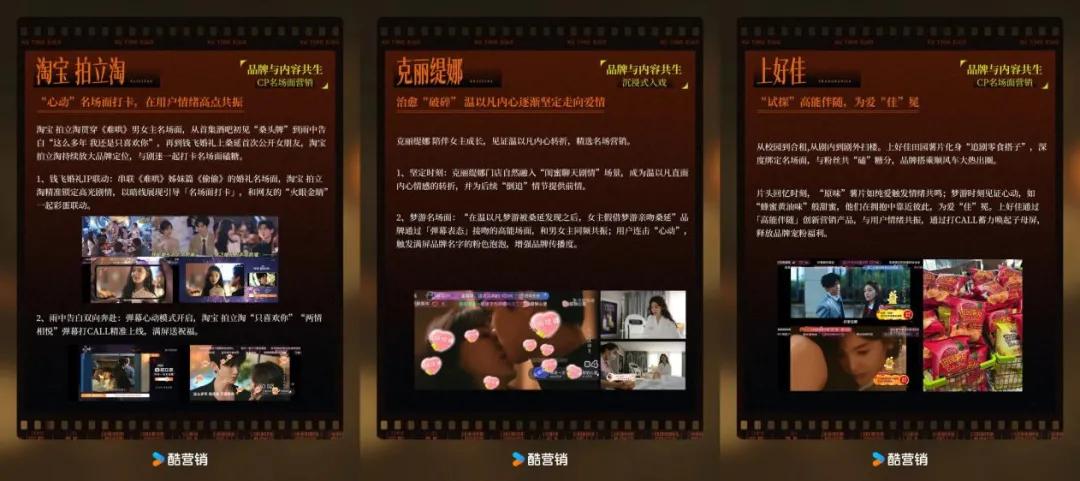 **名場面營銷以小見大,幫助品牌最快鎖定切入口。**名場面是流量、熱度的聚集點和用户茶餘飯後的熱議對象,能為品牌積攢最多聲量。例如,在《難哄》男女主重逢、心動、試探、求婚等名場面中,各大品牌極富創意的露出形式,就讓用户直呼上頭:淘寶拍立淘鎖定錢飛婚禮「名場面打卡」,克麗緹娜在夢遊名場面中通過「彈幕表態」接吻的高能時刻,上好佳「高能伴隨」關聯心動時刻等,品牌和劇情名場面的融合都極為絲滑順暢。