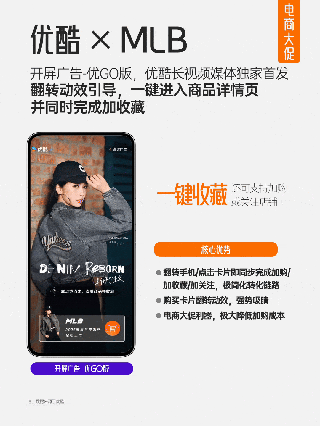 MLB在品牌代言人虞書欣大劇《噓,國王在冬眠》熱播期間,結合優酷獨家首發吸睛產品「開屏廣告-優GO版」,推出MLB品牌定製翻轉動效,以個性化、新鮮感十足的形式引導用户一鍵跳轉品牌天貓官方旗艦店及自動收藏,大幅提升收藏轉化效率。
