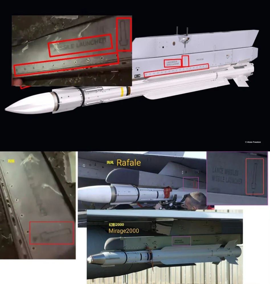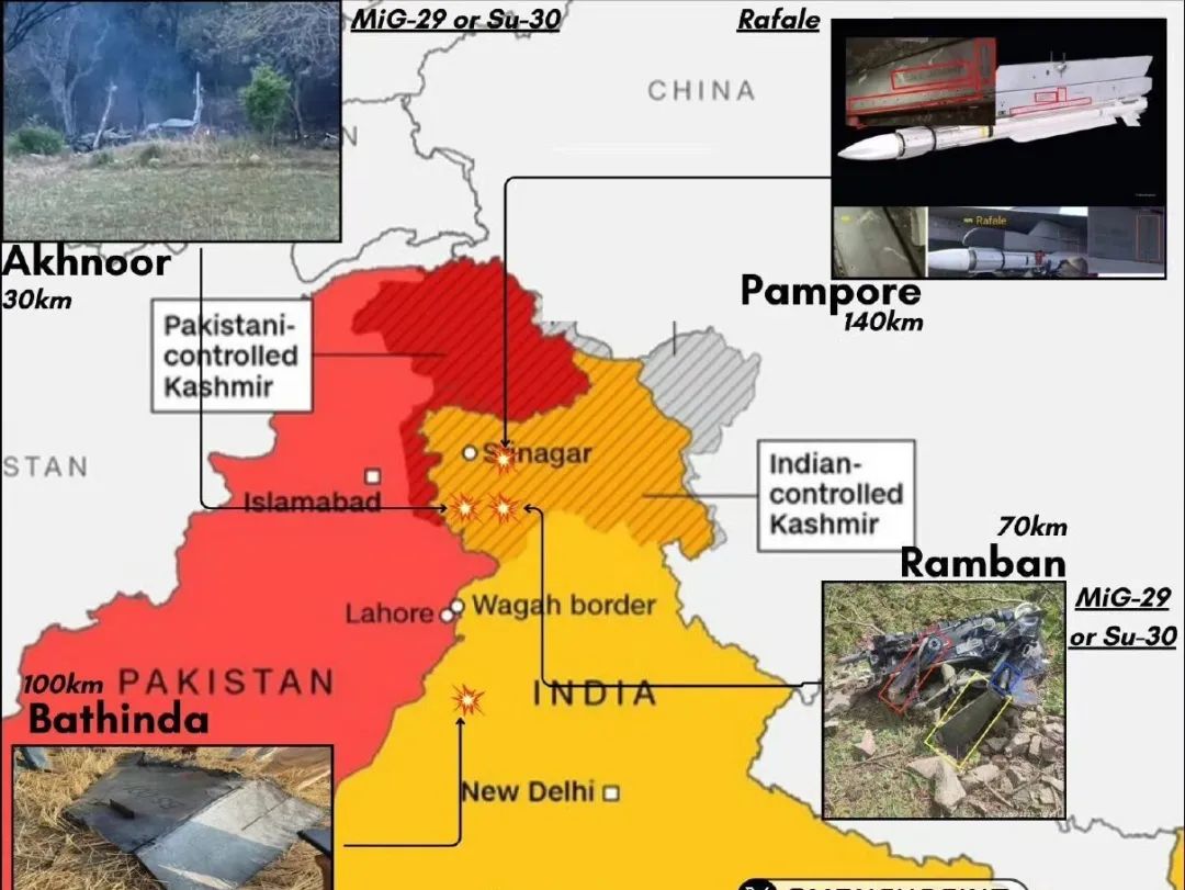 巴基斯坦空軍戰果二:旁遮普邦珀丁達(Bathinda)市比夏納地區(Bhisiana)。一架凌空爆炸、殘片丟的到處都是的戰鬥機,在墜機現場先後發現了“陣風”戰鬥機標準配置的LM3266型導發架、摔碎的MICA導彈。