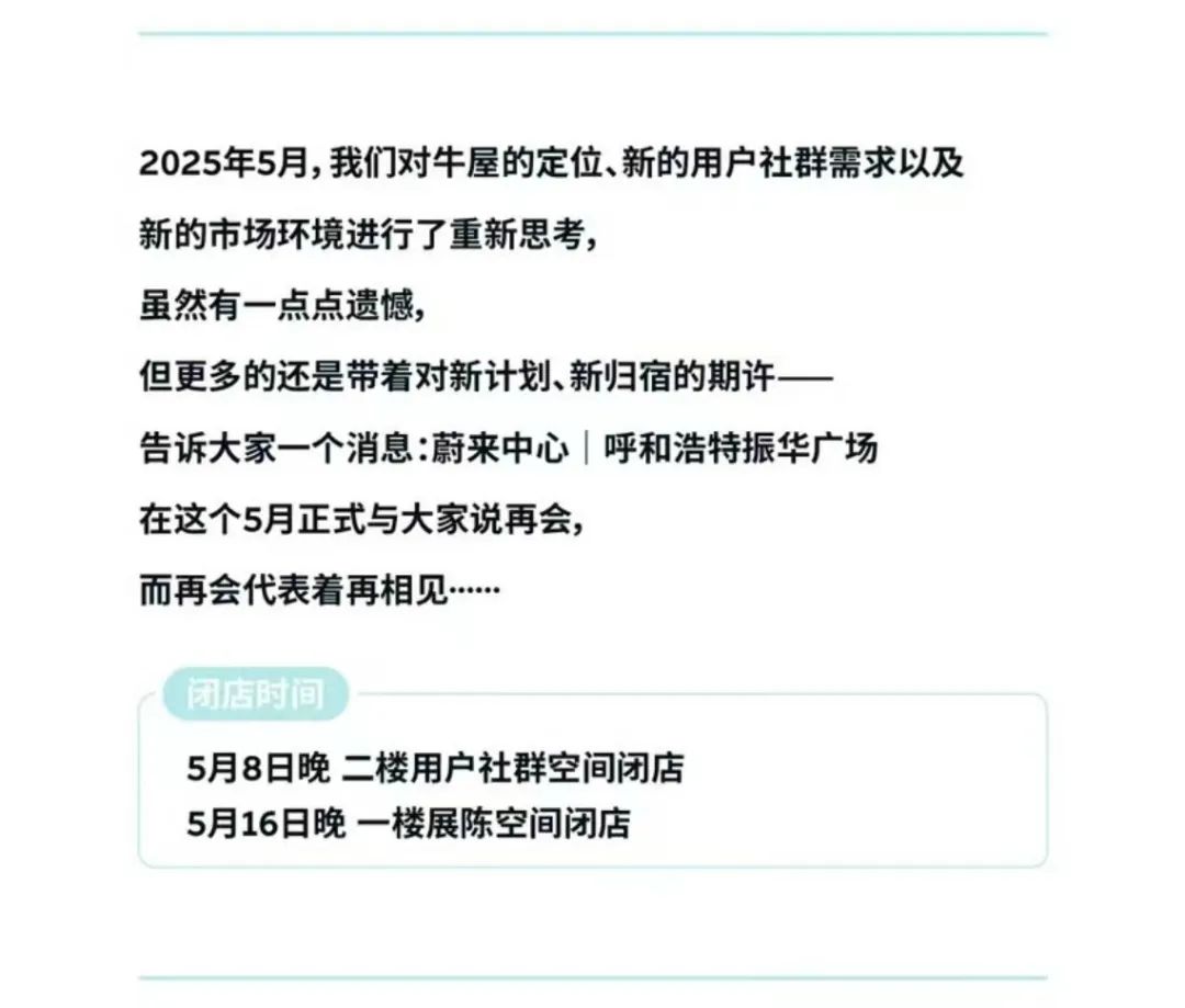 近日呼和浩特“牛屋”官宣閉店,令不少當地蔚來車主感到惋惜。當然,閉店也有可能是自身經營層面以外的因素,例如商場拒絕續租等,但對於呼和浩特蔚來汽車銷售服務公司這個“CBU”來説,確實砍掉了一大筆開支。