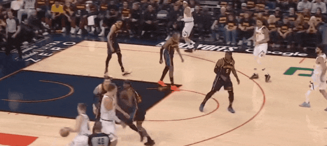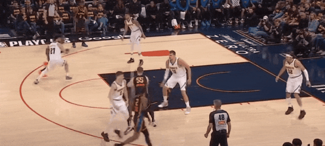 約基奇試圖單吃傑林,但雷霆合圍,拿走約基奇中路,逼他攻底角。