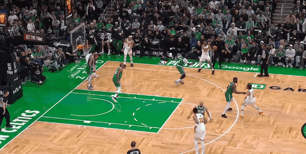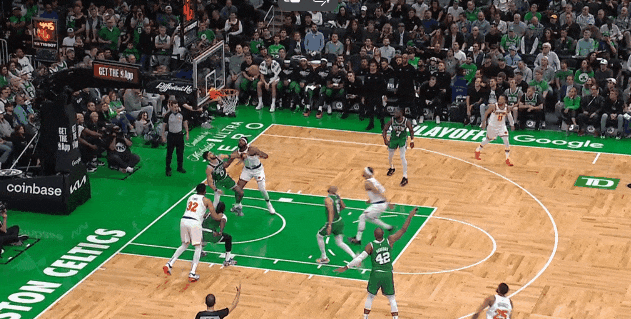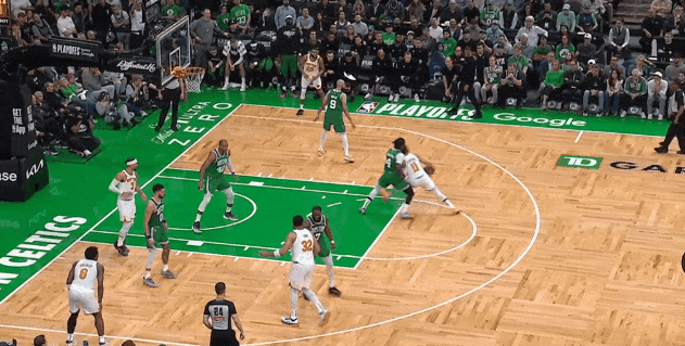 凱爾特人撲外線持球,於是哈特和唐斯們弱側突進、前場籃板。