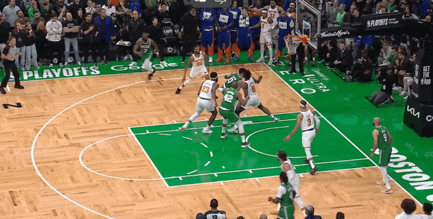 甚至尼克斯套路也多些:哈特的弱側內切,布倫森和大橋的擋拆變化,第四節此起彼伏的前場籃板。凱爾特人第四節繼續輪流持球點名,塔圖姆在翼側時沒有弱側戰術跑。