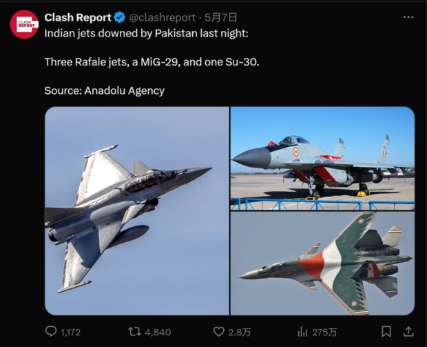 (有外國博主發帖説,巴基斯坦打下5架印度軍機。該貼獲得了2.8萬個贊,但同時,大量印度網民在該貼下堅決否認有印度軍機被打下)