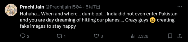 6)我看到一個印度網民的説法就非常具有代表性。在“X”平台上,有一個博主發了巴基斯坦打下5架印軍戰機的消息,這個印度網民卻説,“哈哈哈,這是什麼時間、什麼地點發生的事情?一幫蠢貨,印軍飛機都根本沒有進入巴基斯坦領空。你們不過是在做白日夢,幻想打擊印度軍機。你們這羣瘋子,不過是通過創造一些虛假的圖片來讓自己開心罷了。”