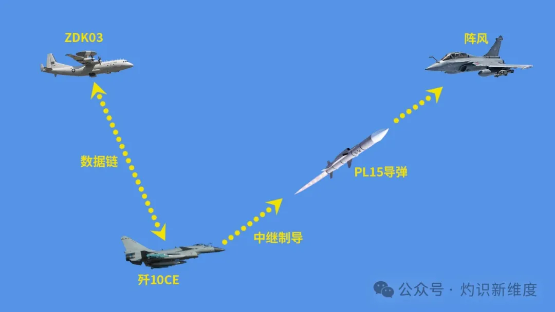 接下來就是關鍵了,巴方射出了這些中國製造的遠程空對空導彈,是由空警500為他們提供印方飛機的位置信息,通過數據鏈提供給導彈載機或其他飛機,轉發中繼制導信號,並不是靠戰鬥機探測敵方位置,因此也就不需要己方戰鬥機,用雷達來鎖定對方的飛機。