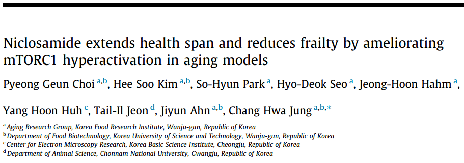 [1] Choi, P. G., Kim, H. S., Park, S. H., Seo, H. D., Hahm, J. H., Huh, Y. H., Jeon, T. I., Ahn, J., & Jung, C. H. (2025). Niclosamide extends health span and reduces frailty by ameliorating mTORC1 hyperactivation in aging models. Journal of advanced research, S2090-1232(25)00271-1. Advance online publication.