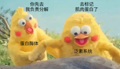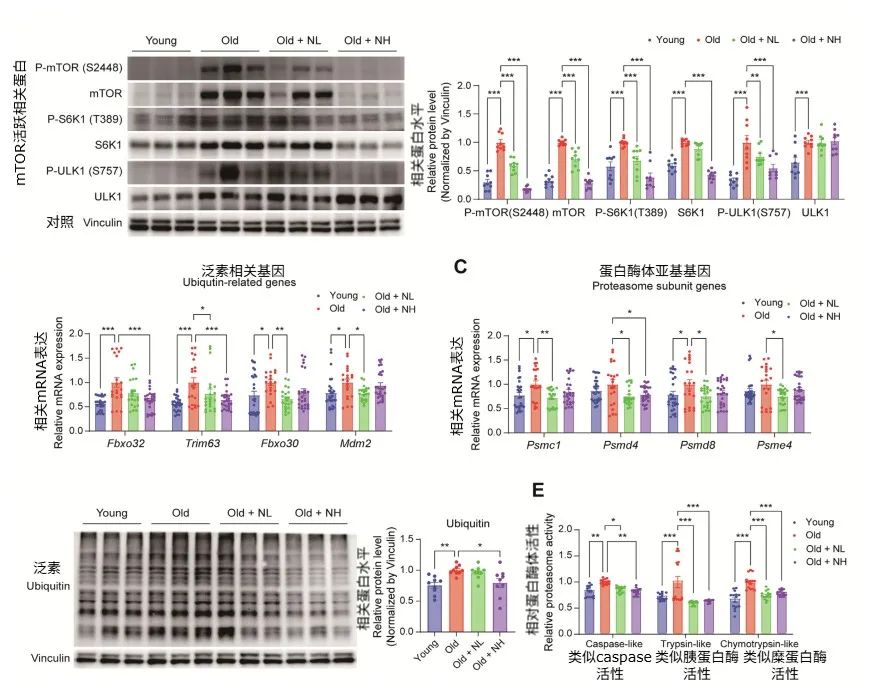 隨着衰老,骨骼肌中與mTORC1通路異常活躍相關的蛋白(如P-mTOR(S2448)等)表達會出現上調,這進一步造成了泛素蛋白酶體系統(維持肌肉蛋白質穩態)的異常激活,使肌肉蛋白質不斷被標記和分解,肌肉出現流失和萎縮。