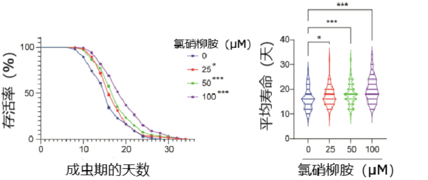 在秀麗隱杆線蟲的壽命實驗中,不同濃度的氯硝柳胺(25、50或100微摩爾),以劑量依賴性的方式將線蟲的平均壽命分別延長了8.11%、12.19%和21.67%,確實表現出了延緩衰老的能力。