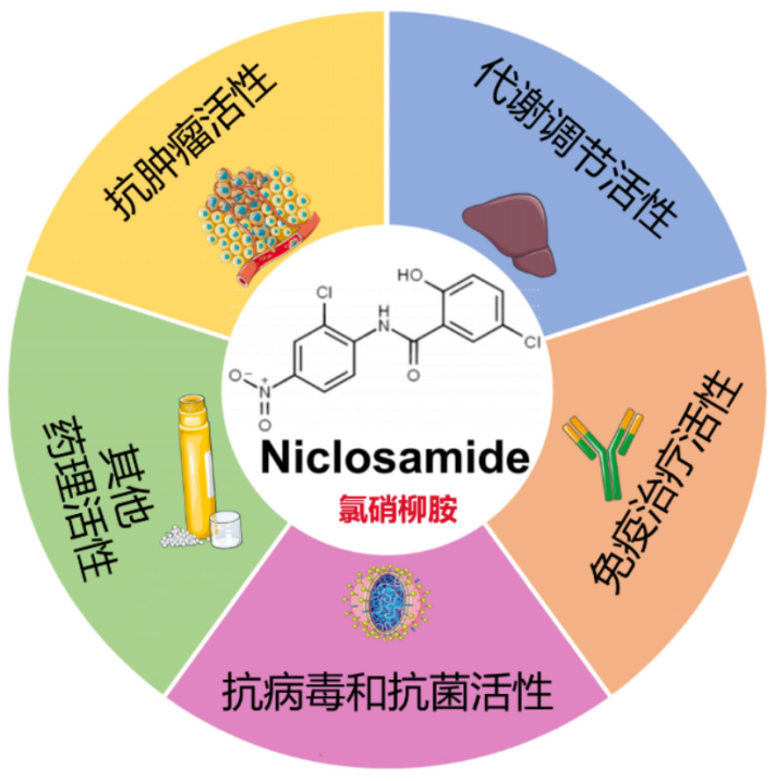 新冠時期,氯硝柳胺就被發現有抗病毒的活性,部分國家甚至開了展小規模的臨牀試驗,以測試其對COVID-19患者的療效[2,3]。另外,在抗癌、抗真菌、代謝調控和抗炎等賽道與氯硝柳胺有關的臨牀前和臨牀研究工作也正在火熱挺進之中。
