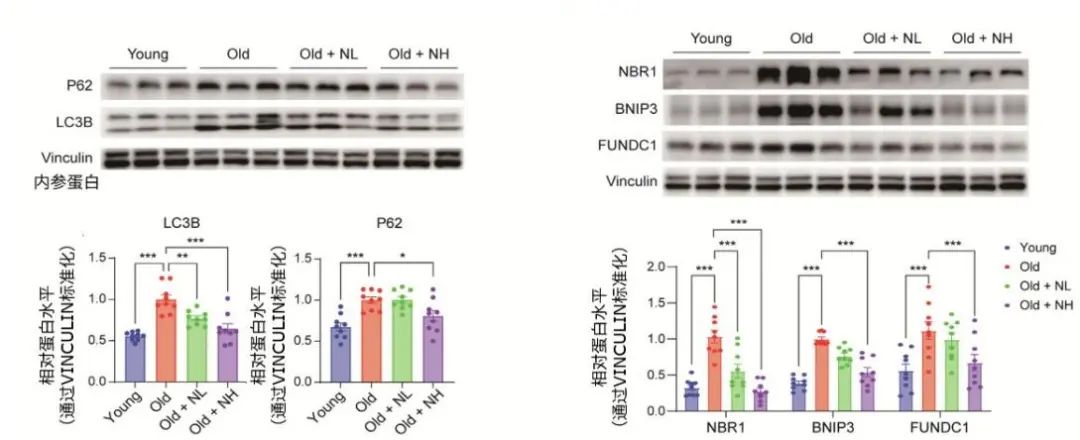 正是如此。在老年組中,研究者觀察到自噬相關蛋白(LC3B 和 P62等)水平的升高,自噬泡(細胞用來分解廢物的結構)的變大。LC3B升高常與自噬泡積累變大有關,而P62升高與清除廢物不徹底相關,兩者共同表明,衰老使細胞的自噬系統變“卡”了。
