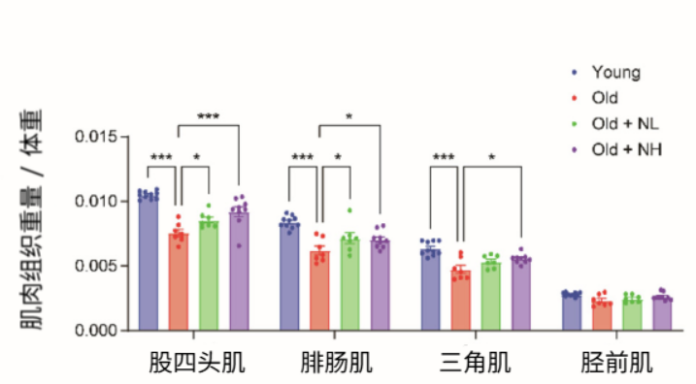 不出所料,氯硝柳胺改善了老年小鼠肌肉量減少的情況,尤其對大腿肌肉(股四頭肌)、小腿肌肉(腓腸肌)和手臂肌肉(三角肌)的效果十分顯著。
