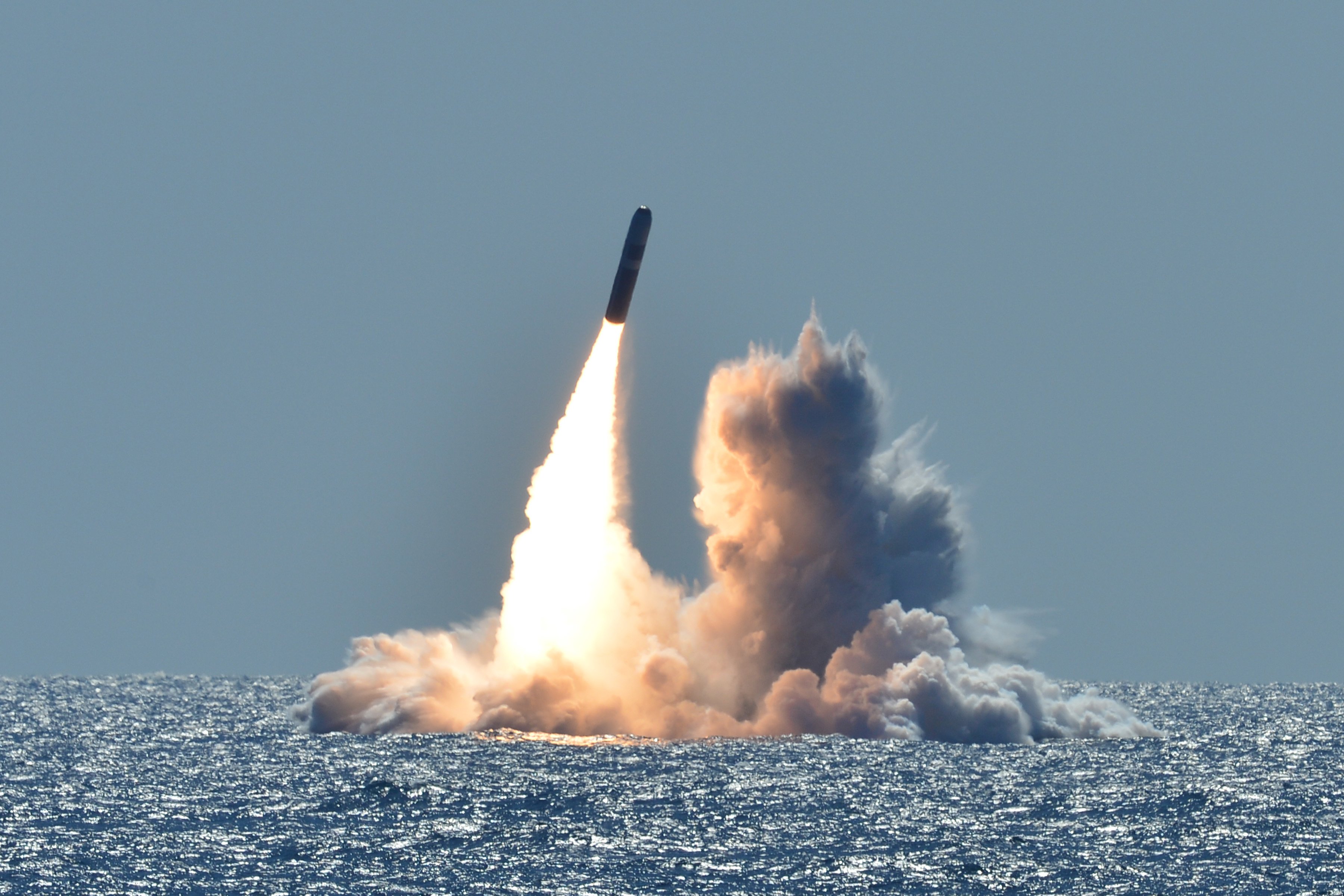 美國海軍“俄亥俄”級彈道導彈潛艇“內布拉斯加”號(SSBN-739)在加利福尼亞州海岸外發射了一枚未攜帶核彈頭的“三叉戟”II D5型導彈。(美國海軍照片)
