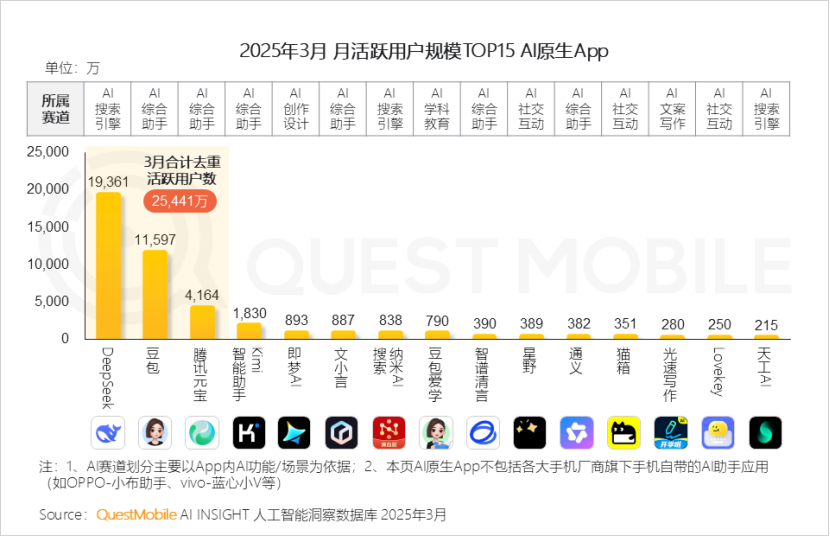 自1月20日DeepSeek R1發佈至今,僅僅用時3個多月時間,DeepSeek就創造了業界神話,截至3月份,QuestMobile數據顯示,其同名APP以超1.9億月活成為國內用户量最大的AI原生應用。