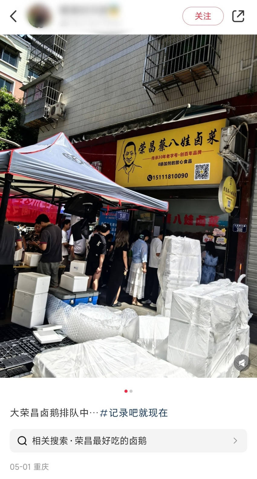比如“榮昌滷鵝”,在這個五一就成為了新晉餐飲“頂流”。據極目新聞報道,五一期間榮昌滷鵝共計賣出290150只,同比增長752.53%。在“榮昌滷鵝”火爆的同時,還帶火了榮昌黃涼粉、鋪蓋面等當地小吃,系列小吃的銷量在假期期間也迎來大幅上漲。比如金錯刀就報道,榮昌一家麪館半天就售出六千碗雞湯鋪蓋面,食客排起的隊伍長達五六十米。