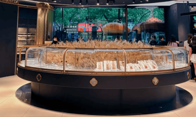 從門店裝潢來看,拾㧚耍整體採用黑金為主色調的簡約風格,門店面積約50平方米。與其他烘焙店常見的長方體櫥櫃不同,其產品陳列區採用圓形玻璃櫥櫃,置於門店正中央,櫥櫃中間還擺着2000根鍍金麥穗模型,為店內增添了幾分藝術氛圍。