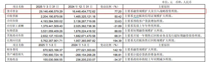 2024年,通威經營活動現金流量淨額保持正流入。截至2025年一季度末,通威的貨幣資金與交易性金融資產總和約400億元。其中,貨幣資金291.46億元,較年初上漲77.20%。