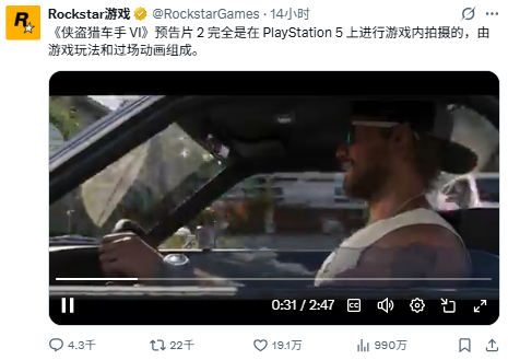 不過可能是聽到了太多的質疑聲,R星昨天再次發文表示預告中的內容全是在PS5上錄製,內容由實機玩法和過場動畫混合而成,只是沒具體説是PS5普通版還是Pro版。
