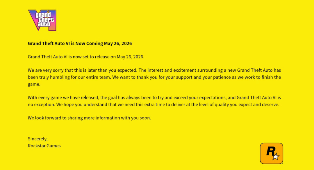 “跳票”對遊戲開發無疑是家常便飯,但幾天前R星宣佈GTA6延期到2026年發售後,不少玩家還是又破防了一次。