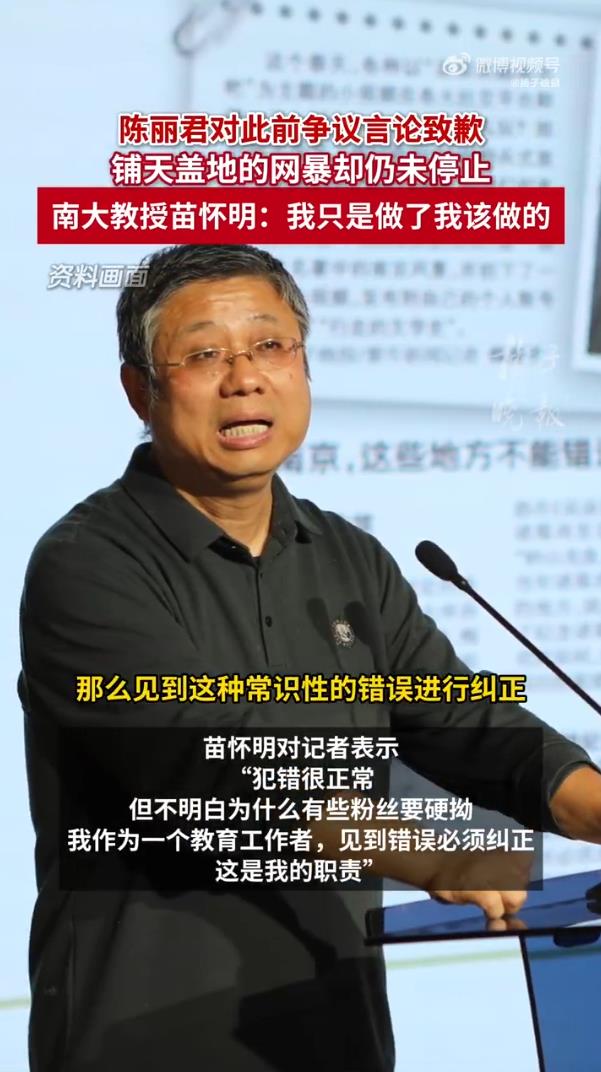 苗懷明教授被罵到懵圈,這位口碑很好的教授以為他只是點出了一個知識點的錯誤,但他不知道自個教陳麗君做人的一番話——“……該去閲讀原著。社會公眾人物應該以身作則,倡導讀經典的良好風氣”——已經惹怒了陳麗君的粉絲羣,這些人向苗懷明發動了一場典型的飯圈攻擊。