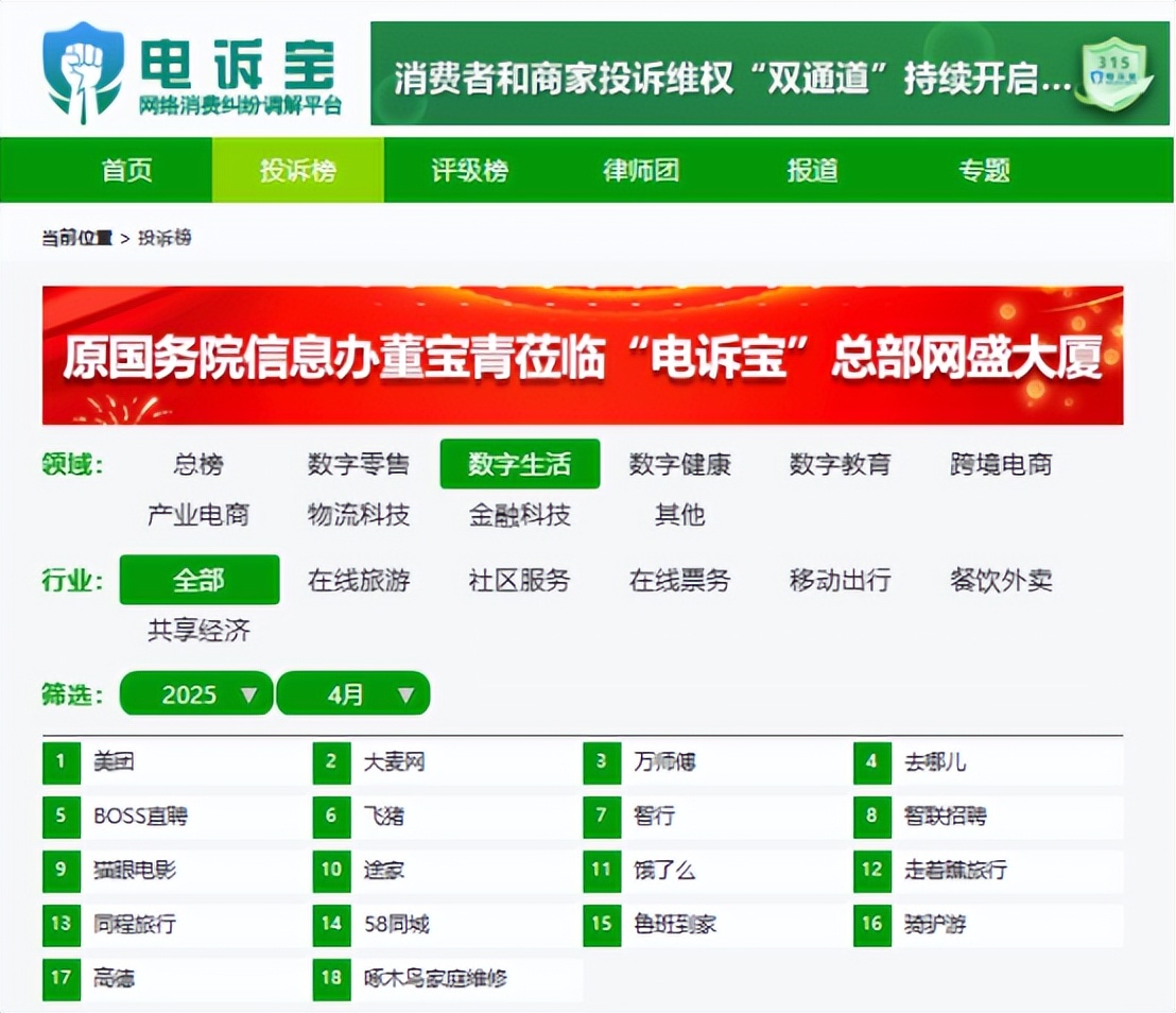 投訴量TOP10依次為:美團、大麥網、萬師傅、去哪兒、BOSS直聘、飛豬、智行、智聯招聘、貓眼電影、途家;