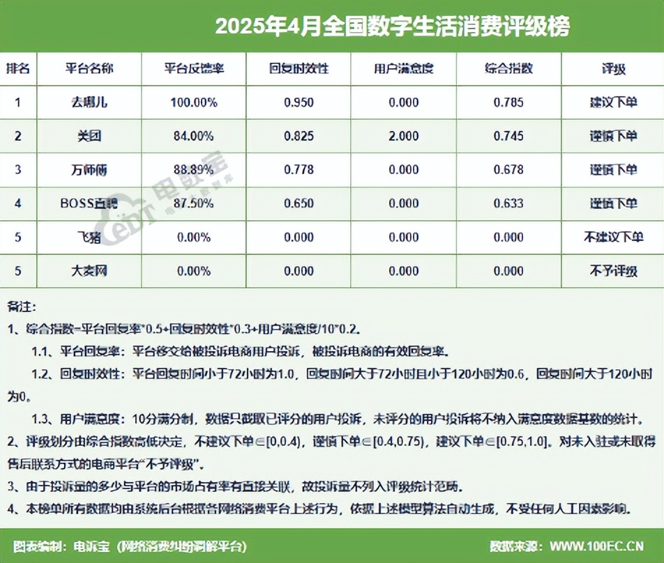 在2025年4月全國數字生活評級榜中:獲**“建議下單”的有:去哪兒等1家;獲“謹慎下單”評級的有:美團、萬師傅、BOSS直聘等3家;獲“不建議下單”的有:飛豬等1家;獲“不予評級”**的有:大麥網等1家。