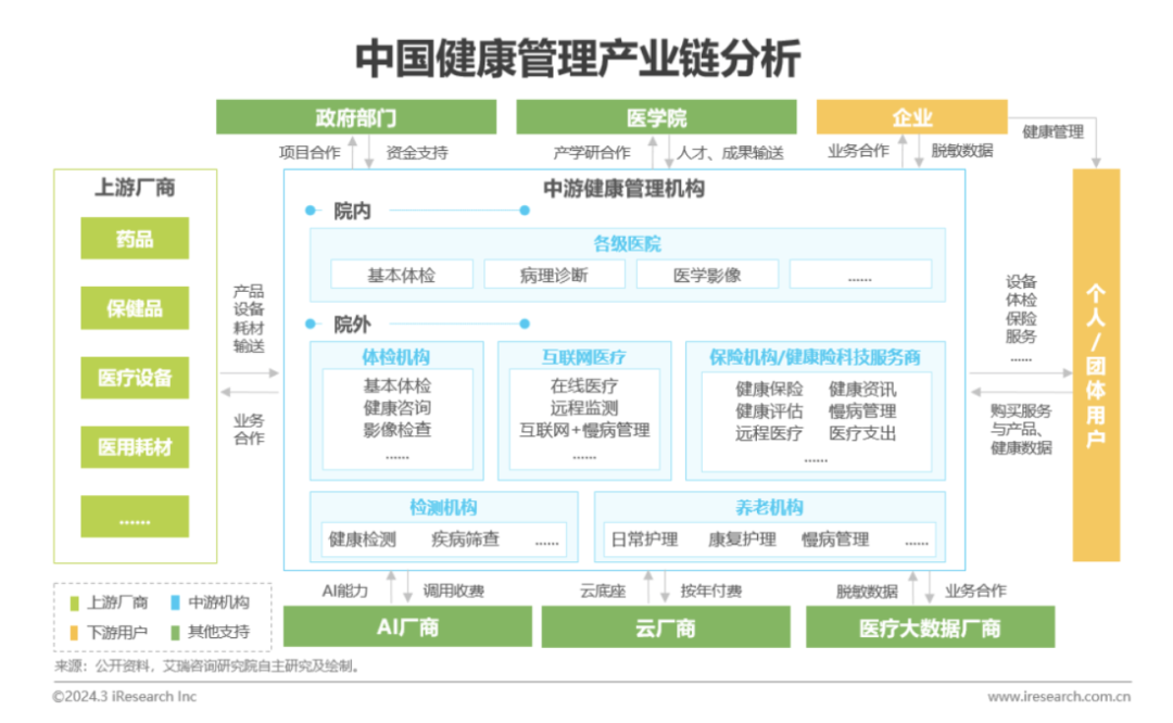 從我國健康管理行業的一整個產業鏈結構來看,艾瑞諮詢相關報告顯示,產業鏈的上游為藥品等生產企業;中游為健康管理相關企業,包含院內及院外兩大場景,院外以互聯網醫院、體檢、保險、檢測、養老+健康管理為主;下游為不同類型的消費人羣,政府部門帶動、產學研支持以及科技賦能貫穿產業鏈的全過程。