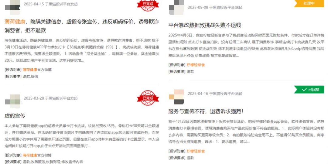 只要用户報名參與,並在達到一定目標要求進行打卡,就能領取免費會員、瓜分獎金池、獲得體重秤等實物獎勵。但從黑貓投訴平台投訴來看,有用户反饋相關此類活動存在隱瞞關鍵信息、誘導用户報名消費、用户誤以為報名費可退等情況。