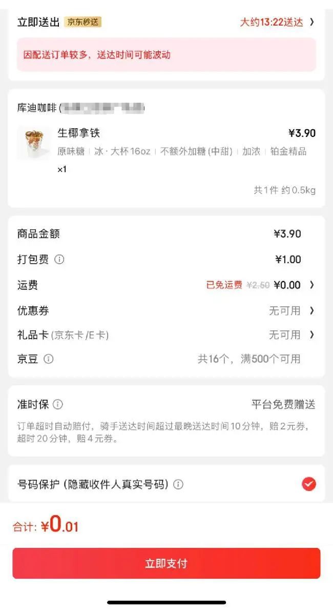 還有用户曬出了京東平台上的外賣訂單,在疊加優惠券及店鋪活動後,只要一分錢就能拿下庫迪的生椰拿鐵。