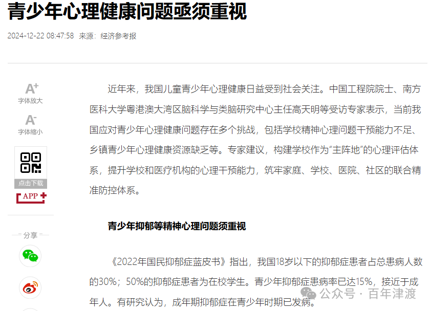 據《2022年國民抑鬱症藍皮書》的調查數據,我國18歲以下的抑鬱症患者佔總患病人數的30%;50%的抑鬱症患者為在校學生。青少年抑鬱症患病率已達15%,接近於成年人。有研究認為,成年期抑鬱症在青少年時期已發病。