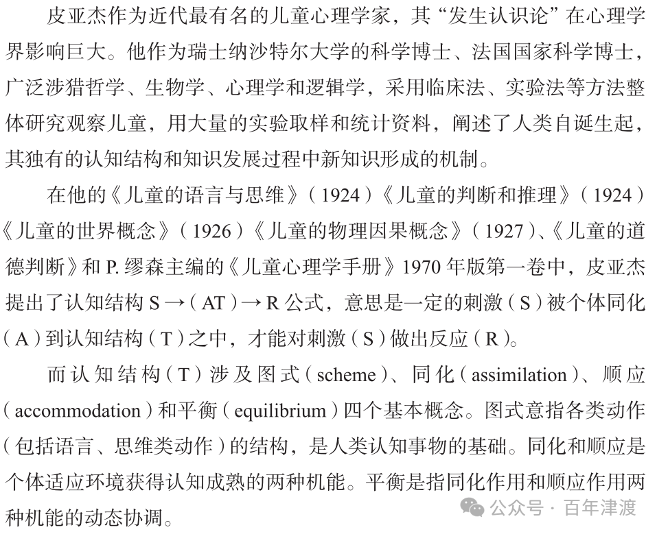 在世界著名心理學家皮亞傑和P•繆森主編的《兒童心理學手冊》1970年版第一卷中,皮亞傑提出了認知結構S→(AT)→R公式,意思是一定的刺激(S)被個體同化(A)到認知結構(T)之中,才能對刺激(S)作出反應(R)。