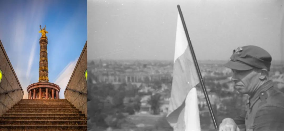 ▲柏林勝利紀念柱(左),波蘭士兵在頂端插上國旗(右)
