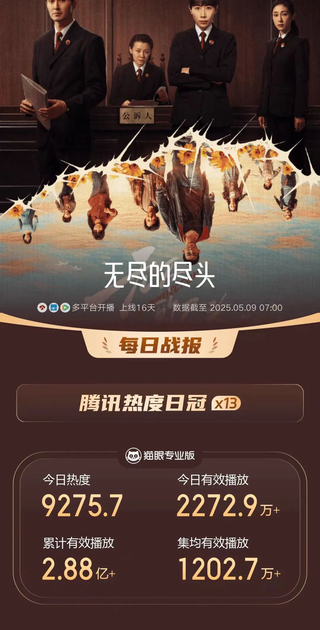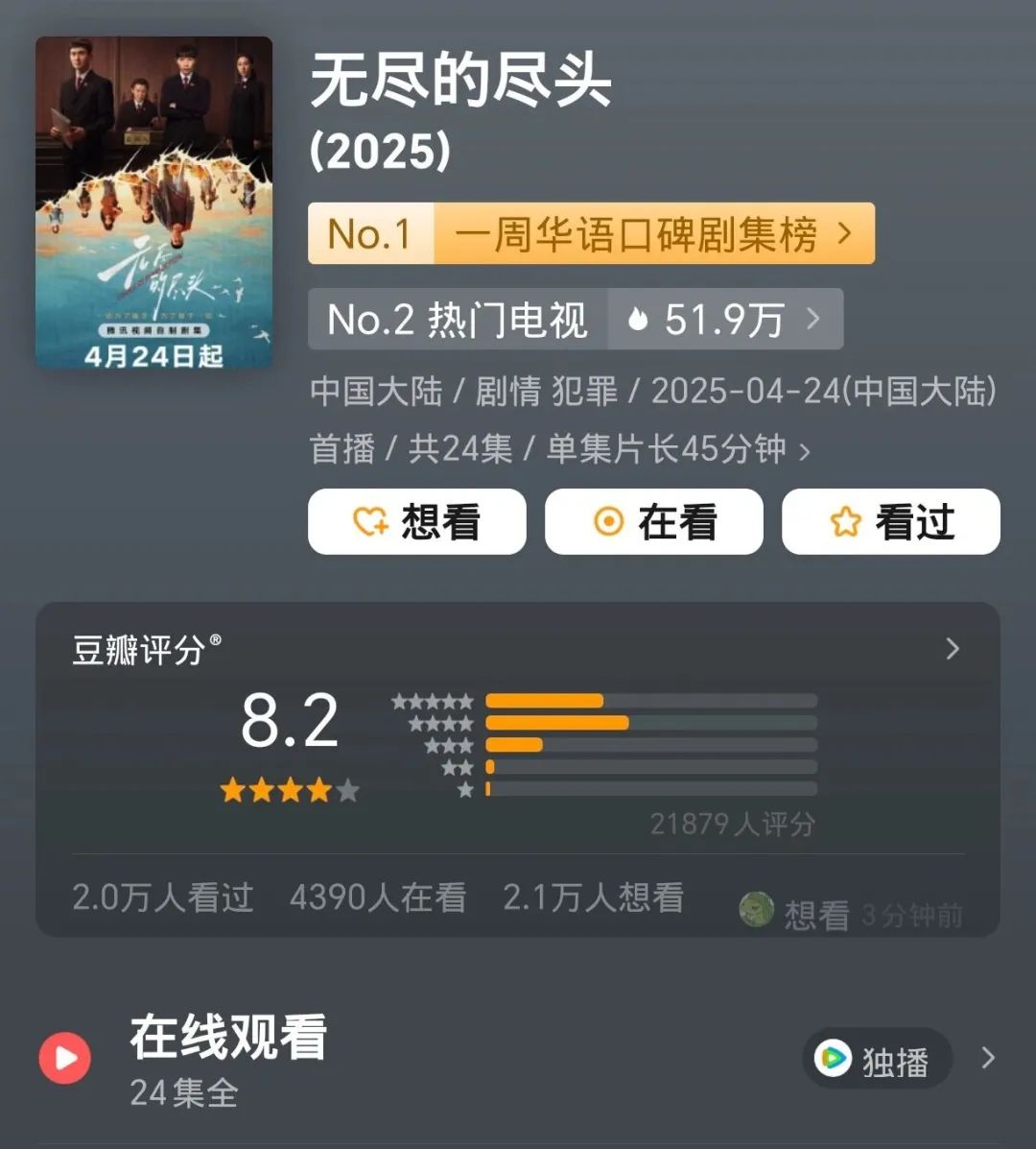 在今年播出的國劇裏,該劇評分在現實題材領域達到top1。自開播以來,《無盡的盡頭》4次獲得貓眼電視劇熱度日榜冠軍,13次獲得騰訊視頻熱度日冠,熱度穩中有升,在同類型題材裏表現可圈可點。
