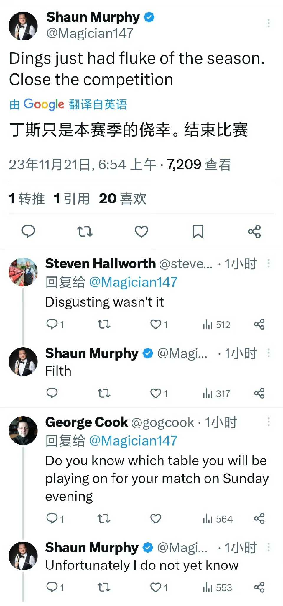 2023年英錦賽資格賽,丁俊暉在致勝局靠一杆暈袋上手。墨菲在推特上直言丁俊暉完成了賽季最佳暈袋並補了一句“filth”(污穢)。