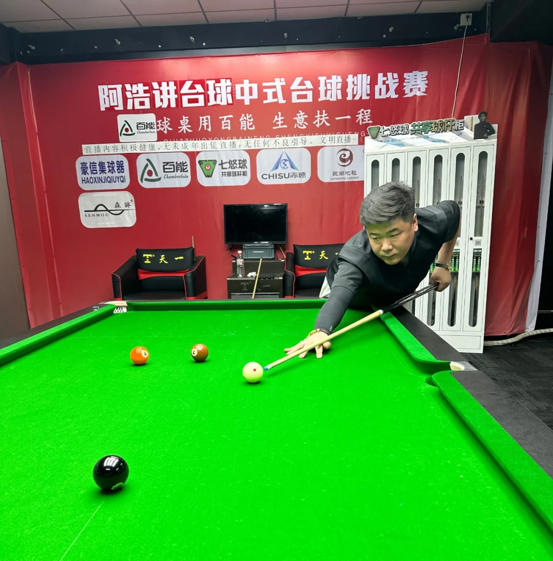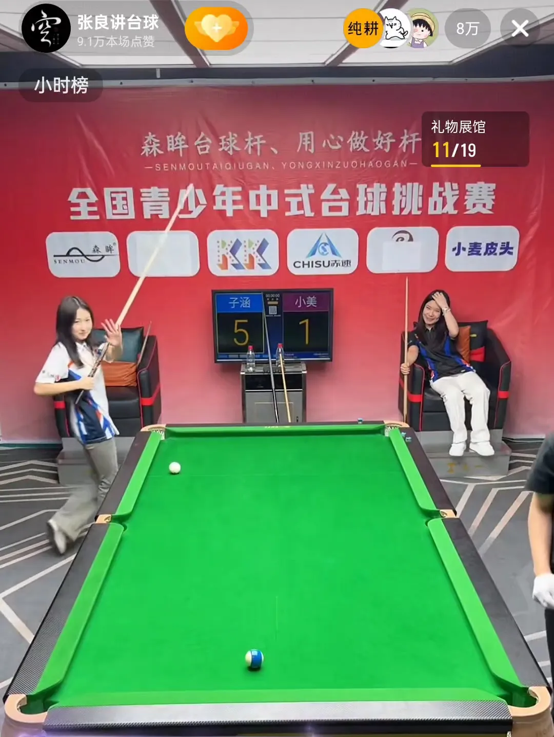 每天晚上10點10分,“全國青少年中式枱球挑戰賽”會在抖音賬號“張良講台球”或者“阿浩講台球”的直播間準時開打。背景噴繪的字樣、選手的着裝、嚴陣以待的裁判和解説都在傳遞同樣的信號——這是一項正式的比賽。