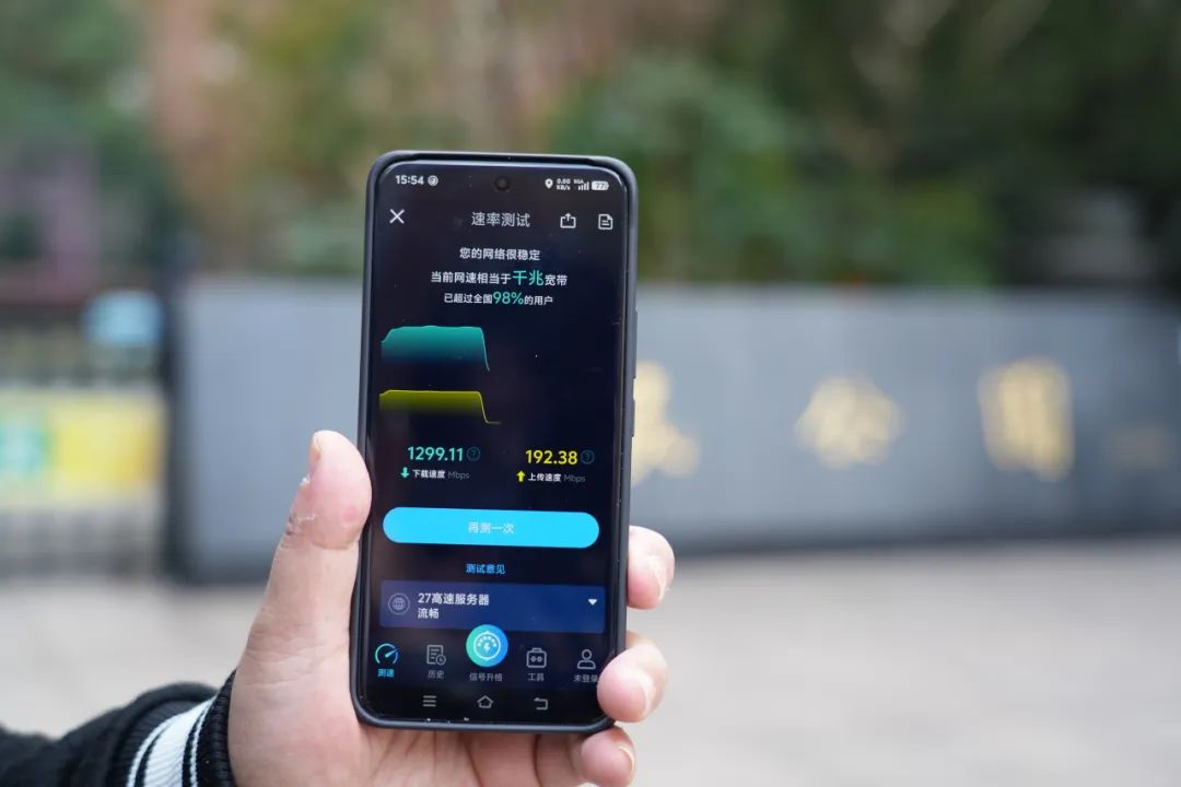 小編打開5G-A手機,在公園門口進行網速實測,結果顯示,平均下載速率高達1299Mbps,平均上行速率則達到192Mbps。此時,手機上進來一通視頻電話,接通後畫面、聲音都非常清晰。隨後,小編在線觀看高清電影,無論將進度條拖曳至何處,畫面立刻播放,沒有絲毫停歇等待。
