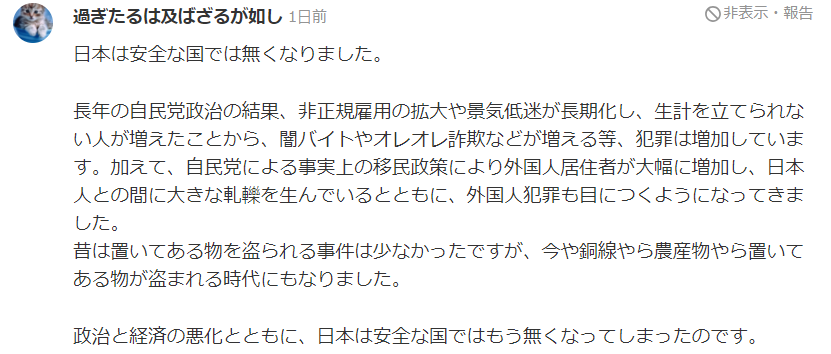 自民黨長期執政導致非正式僱傭不斷擴大、經濟長期低迷,生活困難的人越來越多,由此引發了諸如“黑工”、冒充親人詐騙等犯罪行為不斷增多。再加上,由於自民黨實質上推廣的移民政策,讓在日外國居民數量大幅增加,不僅與日本人之間產生了嚴重的摩擦和矛盾,外國人犯罪也越來越多。