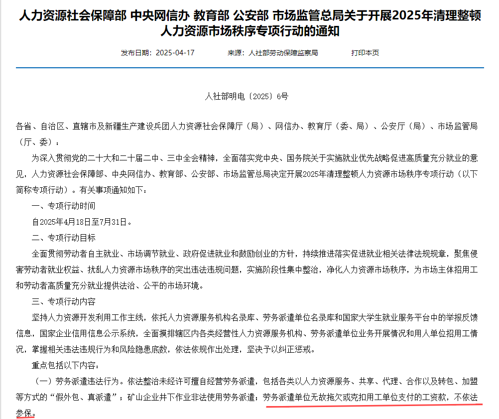 政府層面的積極響應接踵而至。2025年4月17日,人力資源社會保障部、中央網信辦、教育部、公安部、市場監管總局關於開展2025年清理整頓人力資源市場秩序專項行動的通知中明確表示,重點整治**“勞務派遣單位無故拖欠或剋扣用工單位支付的工資款,不依法參保”的問題。**