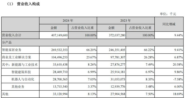 同理,美的老牌智能家居業務更沒有外行所見的那樣式微、不堪,2024年9.4%的營收增速便是最好的明證。