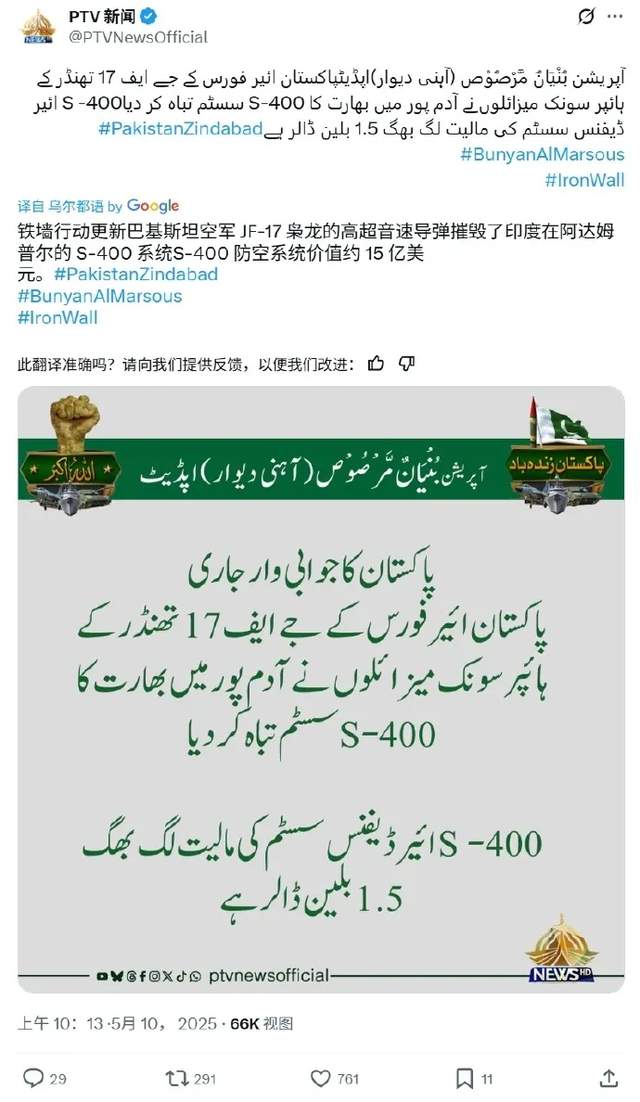 4、採用JF-17“雷霆”戰鬥機發射“高超音速導彈”摧毀了印度部署在阿達姆普爾的俄製S-400防空導彈系統。