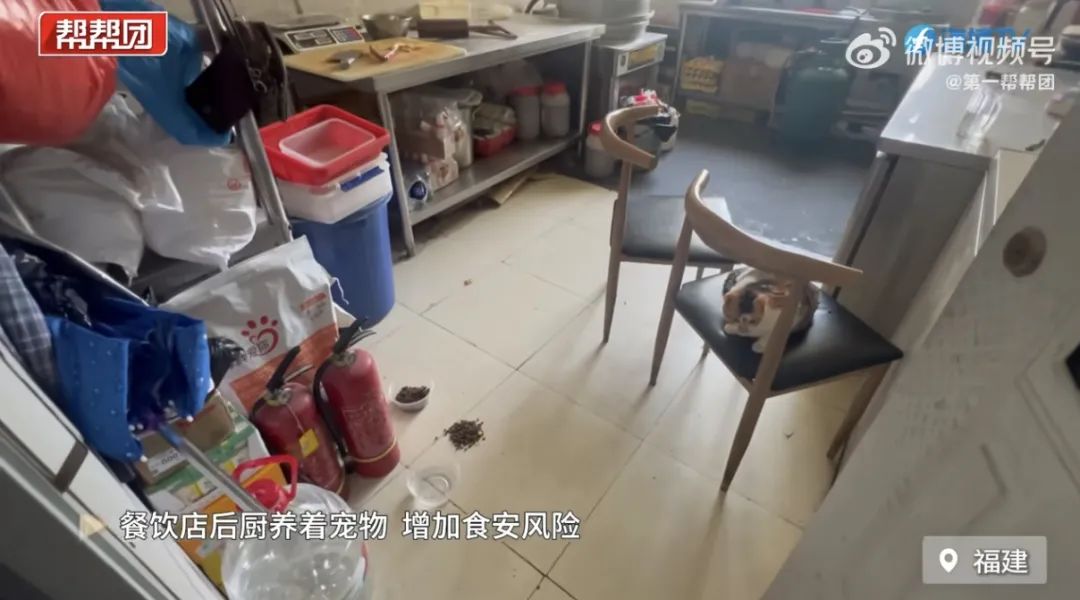 暗訪鏡頭中,還有店的廚房裏養着貓,地上放着貓糧和水。