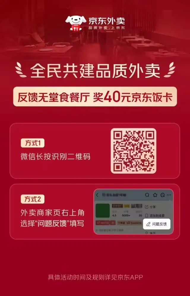 “京東黑板報”稱,若用户發現不符合標準的“無堂食餐廳”混入京東外賣,可通過掃描二維碼或通過商家門店頁右上角“問題反饋”入口反饋。據介紹,反饋將有專人跟進,一經核實,立即對商家進行下線處理。核實下線後,用户還將獲得40元京東飯卡。